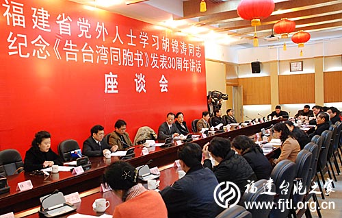 福建臺胞之家網訊:1月15日上午,福建省黨外人士學習胡錦濤同志紀念《告臺灣同胞書》發表30周年講話座談會在福州舉行。省委統戰部張燮飛部長、省委統戰部常務副部長翁卡,省政協副主席、省工商聯主席李祖可、省政協副主席、民進省委會主委張帆、省政協副主席、民盟省委會主委鄭蓀、農工黨省委會主委、省農業廳廳長陳紹軍等領導出席了座談會。