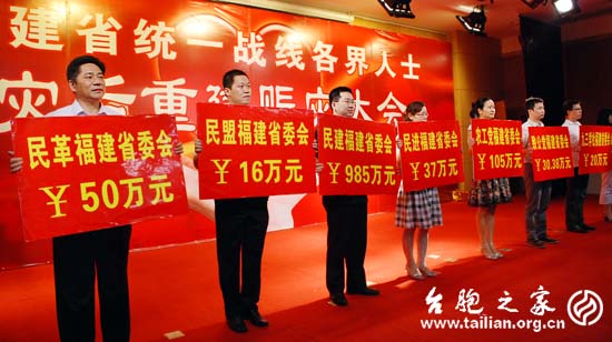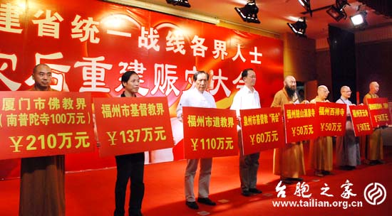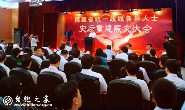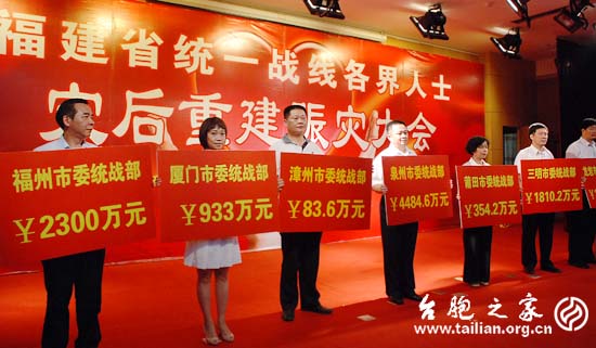 臺胞之家網7月8日訊:今天上午,由中共福建省委統戰部、省海外聯誼會、省工商聯、省光彩事業促進會主辦的福建省統一戰線各界人士災後重建賑災大會在福州“同心樓”召開,省領導于廣洲、洪捷序、張燮飛、李祖可、郭加振及各民主黨派領導、有關人民團體負責人、省五大宗教團體負責人、無黨派人士、省直黨工委、教育工委、團省委統戰部負責人、捐款單位代表、捐款企業家和統一戰線各界人士約200人參加大會。省臺聯副會長葉露昆及機關幹部參加了賑災大會。