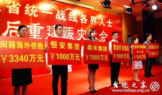 上午的賑災會上,福建省統一戰線各界人士本著“同舟共濟、戮力同心”的精神,積極參與,踴躍捐款,以實際行動有力地支援了災區恢復生產,重建家園工作。至會議結束時不完全統計,福建省統一戰線各界人士為災後重建共募集款物價值約1.37億元人民幣和1400多萬港幣,有力地支援了災區重建工作。