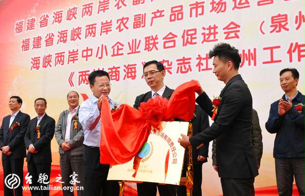 臺胞之家網福建臺聯訊:3月23日,福建省海峽兩岸農副產品交易市場有限責任公司、福建省海峽兩岸農副產品市場運營管理有限公司以及做為發起人之一的海峽兩岸中小企業聯合促進會(泉州聯絡處)、《兩岸商海》雜志社在泉州同時揭牌。省臺聯、省工商聯、省農業廳、省臺辦及臺灣中華領袖精英交流協會蔡陣勳會長等出席揭牌儀式。