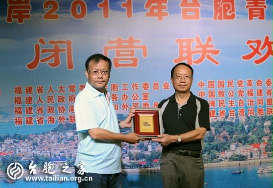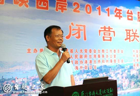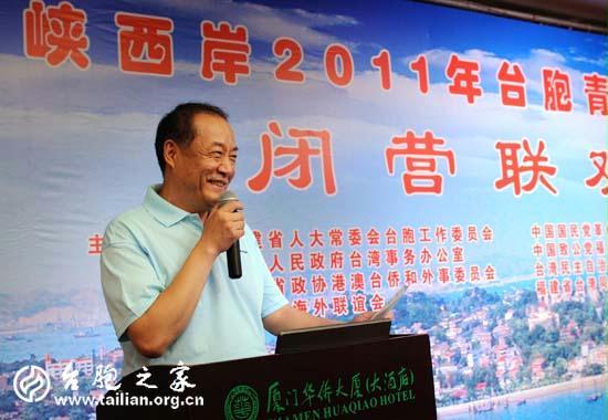 閉營式由福建省臺聯副會長葉露昆主持,全國臺聯副會長、省臺聯會長陳耀中代表主辦單位致辭。他說,福建與臺灣有著地緣、血緣、文緣、商緣、法緣的千絲萬縷聯係。同學們翻開自家的祖譜,就會發現大多數人祖上來自福建泉州府、漳州府或者客家聚居地。今天你們有機會回到祖籍地,回到你們祖父輩生長的地方那樣尋根問祖、參觀遊覽,感受一脈相承的中華傳統文化,感受兩岸血濃于水的同胞親情,多麼值得可喜可賀。當前,兩岸關係和平發展成為兩岸同胞共同願望所係、共同利益所在。加快建設海峽西岸經濟區,是祖國大陸為臺海地區謀和平、為兩岸同胞謀福祉的實際行動,也是海峽兩岸共同面臨著難得的歷史性發展機遇。對于年青人來說,在海峽西岸這片熱土上,有許多創業的機會,希望你們把參加夏令營當作一個契機,經常來,多走走,多看看,多了解,多溝通,為我們的共同家園的發展,為共創兩岸和諧雙贏的局面、為中華民族的騰飛,共同的努力。