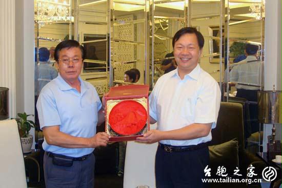 全國臺聯聯絡部何長明部長(右)看望臺灣客人並相互交換禮物 周雄銘/攝影