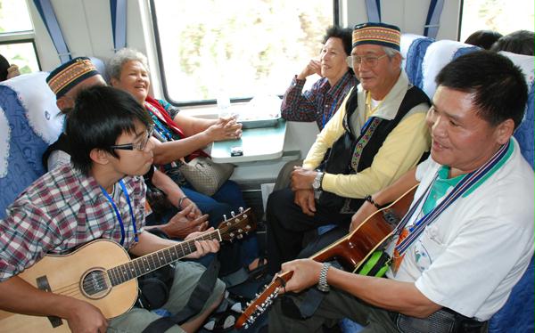 2008年首屆“豐收節”上,臺灣鄉親乘火車一路歡歌 鄭嵐/攝影