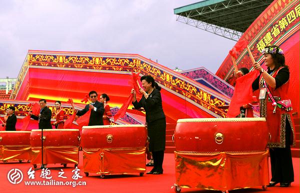 福建省委常委、統戰部部長雷春美(右二)等領導嘉賓擂鼓開幕。右一為臺灣原住民族企業人協會事理事長陳姿伶。鄭嵐/攝影