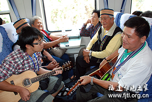 首屆海峽兩岸少數民族豐收節的臺胞們今天一早乘“武夷快”列車往武夷山參觀。五個小時的車程真有點長,可對于一路歡歌的臺灣原住民族而言有些短。兩岸同胞聊家常,憶童年,詢家鄉近況,聊大陸變化,一路歡歌一路情,五個小時的車程轉眼而去。