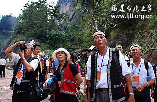 下午,臺胞們前往世界歷史、文化“雙遺產”武夷山參觀。武夷山遺產地處中國福建省西北部,總面積999.75平方公里。根據區內資源的不同特徵,將全區劃分為西部生物多樣性、中部九曲溪生態、東部自然與文化景觀以及城村閩越王城遺址等4個保護區。核心面積63575公頃,核心次面積36400公頃,同時,劃定了外圍保護地帶--緩衝區,面積27888公頃。