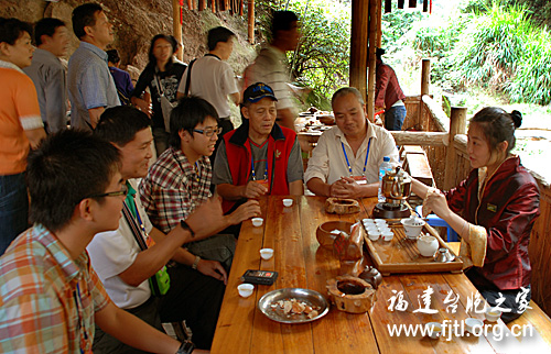 臺胞們來到早已耳聞的“大紅袍”茶的生長地參觀,親眼目睹“大紅袍”茶樹的芳容。沏上一“泡”武夷岩茶,聽武夷茶藝姑娘的介紹,品一口久聞的茗茶無比愜意。