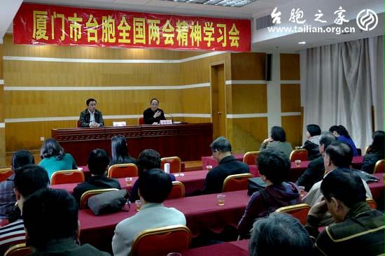 臺胞之家網訊:3月26日下午,廈門市臺聯舉辦在廈臺胞“兩會”精神學習會。全國人大代表、全國臺聯會副會長、福建省臺聯會長陳耀中傳達了全國 “兩會”精神,廈門市臺聯黨組副書記、常務副會長陳永東主持會議,在廈臺胞數十人認真聽取了“兩會”精神傳達。