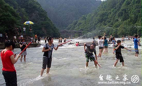 一進入這天然的水上遊樂場,營員們都紛紛拿起事先買來的水槍,朝著認識不認識的遊客一通猛射,膽小的女生此時只有忙于招架,而膽大的則有的躺在水里隨波逐流,有的坐進水中滑槽享受清涼,有的走到溪中央的拱橋上戲耍。營員們忘情地享受著回歸自然的樂趣,嬉戲聲、歡叫聲伴隨著年輕人的歌聲蕩漾在空中……