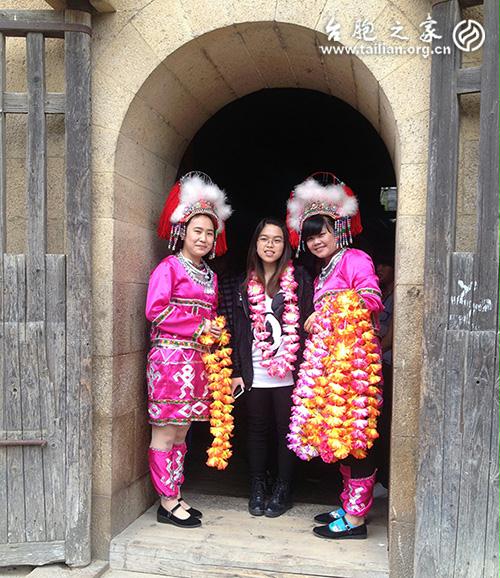 客家姑娘在土樓門前用花環歡迎臺灣大學生的到來。王珊珊/攝影