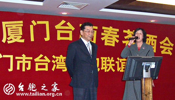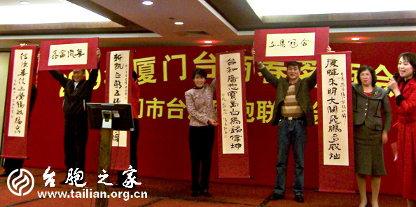 元宵將至,聯歡大廳歡聲笑語,彌漫著歡樂祥和的節日氣氛。盧紹荀會長攜各位副會長及機關幹部獻上兩幅吉慶紅聯,以中華民族傳統的賀年形式向臺商恭賀新春,“廈暉來明大關飛鵬多威燦,臺和廣懋寶島白馬銘偉坤——合冠集立”,“新凱正新五強永大永隆,信億華信三榮福聯福泉——華胤富鑫”,兩幅上聯、下聯、橫批全部由廈臺企名稱組成、由廈門臺胞書法家親筆手書的對聯一經亮出就引得眾賓朋齊聲叫好。當前雖遇經濟嚴冬,在廈臺商卻充滿自信與樂觀,相互勉勵,攜手攻克時艱,共渡難關。市臺聯盧紹荀會長、臺商協會曾欽照會長登臺合唱閩南語歌曲《針線情》,唱出了臺聯與臺協的友好情誼;市臺商協會副會長、傑宏電子有限公司董事長許政郎先生即興賦聯“全面直航大三通,兩岸交流新紀元”,臺商對兩岸實現三通的欣喜之情溢于言外。富鑫董事長盧國山借一曲《愛拼才會贏》,與兄弟企業共勉。臺聯、臺協的朋友們你方唱罷我登場,正如民間將元宵稱為中國的狂歡節,眾賓朋在這個夜晚痛痛快快地狂歡了一把。(圖文:廈門臺聯 戴曉玫)