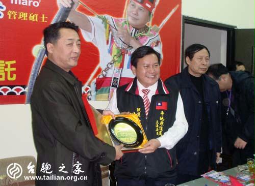 省臺聯秘書長張岩(左一)與桃園縣議員洪國治交換禮品 攝影/邱紅
