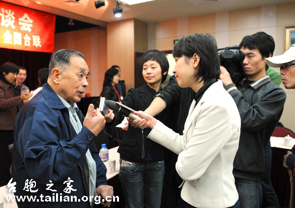 當年參加過抗日戰爭的老臺胞何標在座談會上接受媒體記者的採訪。(徐波/攝影)