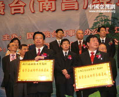 在儀式上,為此次設立的5個臺資企業轉移承接基地和5家臺商創業園進行了授牌。它們分別是:南昌高新技術開發區臺資企業轉移承接基地、南昌經濟技術開發區臺資企業轉移承接基地、江西贛州經濟開發區臺資企業轉移承接基地、江西吉安高新技術產業園區臺資企業轉移承接基地、江西上饒經濟開發區臺資企業轉移承接基地,以及江西撫州金巢經濟開發區臺商創業園、江西共青城臺商創業園、江西上高臺商創業園、江西瑞金臺商創業園、江西向塘臺商創業園。