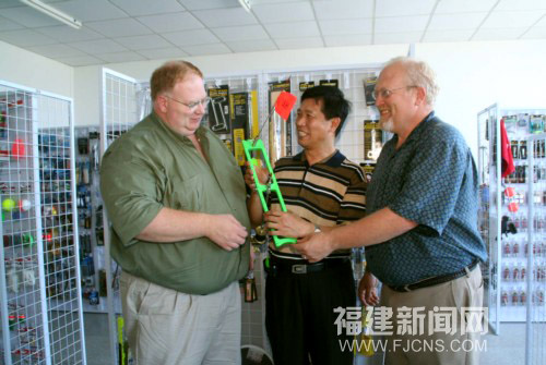 8月3日,美國威斯康新洲2名客商專程來到福建東山的臺資企業元煌集團參觀新開發的漁具、釣具樣品,簽下一筆大額訂單。由臺商呂榜洲先生創辦的元煌集團,積極應對國際金融危機,今年來開發歐美新興的冰上釣具、漁具等6個係列產品,暢銷國際市場。(謝漢傑 攝)