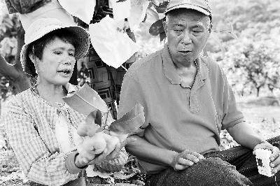 何文淵夫婦倆席地而坐,探討蓮霧的色澤和質量。圖片來源:福建日報