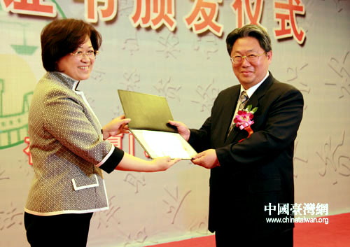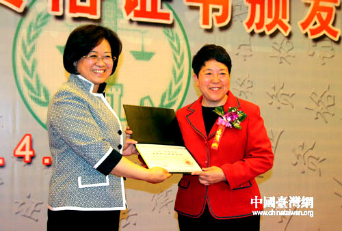 國家司法考試司司長丁露為獲得律師職業資格的臺灣居民頒發資格證書。(中國臺灣網 張弛 攝)