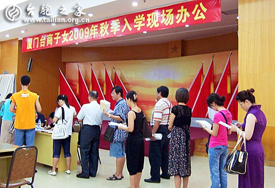 臺胞之家網8月5日訊:(文/圖 戴曉玫)廈門臺商子女2009年秋季入學現場辦公于8月5日上午在團結大廈舉行。這是市教育局、市臺辦、市臺聯自2002年以來,連續第八年為臺商子女在廈入學提供“一站式服務”。之前,幾家單位已聯合召開咨詢會和協調會,告知家長辦理流程、所需材料,並根據面向臺商的“有條件擇校”優惠政策為臺商子女安置學校。在辦公現場,市教育局、市臺辦、區教育局工作人員“流水作業”,備齊資料的臺商家長不出十分鐘即可辦妥手續。個別資料不符合要求的,市臺聯還提供現場指導、復印等服務。