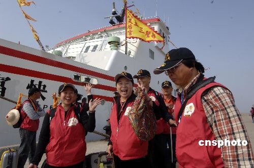 2月13日,搭載著428名臺灣媽祖信眾的“合富輪”緩緩抵達“媽祖故鄉”湄洲島的3000噸級對臺客運碼頭。這是2008年底海峽兩岸簽訂“兩岸海運協議”後的第一個兩岸海上客運直航活動,也是湄洲島口岸繼與金門、馬祖實現海上客運通航後的又一突破。圖為臺灣媽祖信眾抵達後非常興奮。 中新社發 王東明 攝
