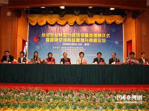 中國臺灣網4月8日泉州消息 為幫助臺資企業轉型升級,應對在全球蔓延的金融危機,大陸第一家臺資企業轉型升級培訓基地今日落戶福建省泉州市。今天上午,臺資企業轉型升級培訓基地授牌儀式暨品牌交流與經營提升策略論壇在泉州酒店隆重舉行。此次活動旨在幫助廣大臺資企業尋求突圍解困之路,轉變經營策略,轉換經濟發展方式。