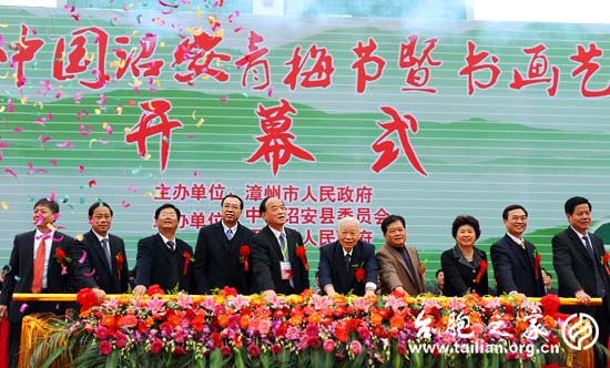 臺胞之家網訊:以“打響品牌、展現魅力、拓展平臺、跨越發展”為主題的第四屆中國(詔安)青梅節暨書畫藝術節,今天上午在福建漳州詔安縣舉行隆重開幕儀式。九、十屆全國政協副主席張克輝出席開幕式。國家、省、市及有關部門領導、閩粵周邊縣市(區)有關領導、社會各界人士共計1000多人參加了青梅節的開幕式。省臺盟副主委江爾雄、省臺聯副會長柯連妹以及臺灣工黨主席鄭昭明應邀出席開幕式。