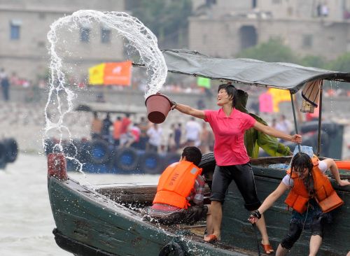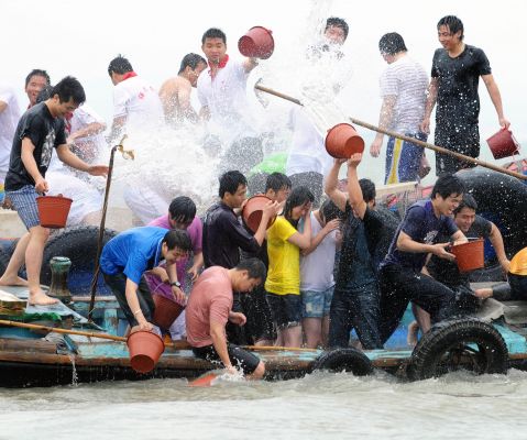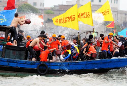 “清涼的海水潑過船去,美好的祝福帶給對方”。蚶江漁民蔡榮勝告訴記者,“端午節的海水是吉祥之水,潑到就是福氣!”