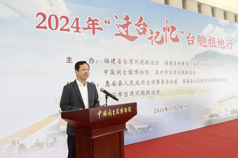 11月27日上午,2024年“遷臺記憶”臺胞祖地行活動在中國閩臺緣博物館正式啟動。臺灣島內嘉賓、在閩臺青、兩岸婚姻家庭子女以及檔案文獻捐贈代表等50余人參加活動。省臺聯黨組書記劉良輝,泉州市委常委、宣傳部部長、統戰部部長劉林霜,中國閩臺緣博物館黨委書記陳璇,省檔案館二級巡視員謝雲,省姓氏源流研究會副會長魏淵樓等領導出席啟動儀式。啟動儀式由泉州市臺聯會長蘇悅主持。
