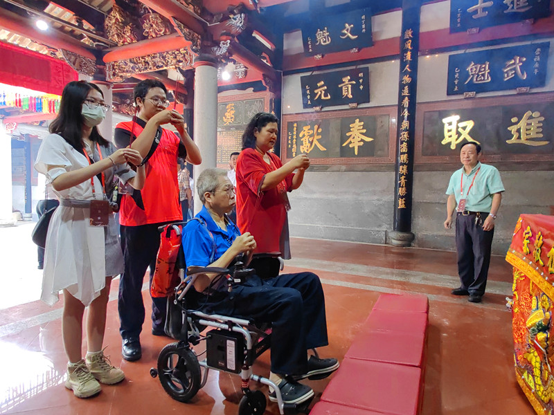來自臺灣同名村雲林縣北港鎮的蔡爾容,是臺灣非遺手工藝紙質神像唯一傳承人。盡管中風後腿腳不便,他仍坐著輪椅,帶上妻子和兒子兒媳,一家四口隨同其他10余名臺灣鄉親,專程到祖籍地泉州石獅市靈秀鎮容卿村懇親祭祖。他說,10年前,他帶著妻兒一起首次回鄉探親的情景,至今還歷歷在目。這次返鄉,特地帶上其新婚的兒媳一起回來,讓她也認祖歸宗、不忘根脈。他還說,一路上故鄉的變化和家鄉親人的熱情,讓人無比欣慰和感動,兩岸一家親。