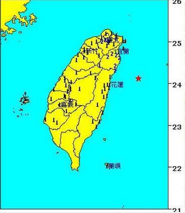 初估這起地震深度19.6公里,各地震度為宜蘭市3級(幾乎所有人能感覺搖晃,有的人會有恐懼感),新北市五分山、臺北市信義區以及臺北市,花蓮和平2級(大多數人會感到搖晃,睡眠中的人有部分會醒來),其余像是花蓮市、南投合歡山、桃園市三光、基隆市等1級(人靜止時可感覺微小搖晃),目前未有災情傳出。(中國臺灣網 盧佳靜)