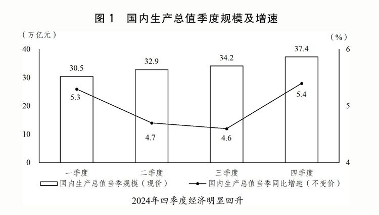 (一)因時因勢加強和創新宏觀調控,推動經濟回升向好。扎實開展宏觀政策逆周期調節,加大政策力度,釋放政策效能,特別是9月26日中央政治局會議果斷部署一攬子增量政策,市場預期、社會信心有效提振,四季度經濟明顯回升。全年國內生產總值(GDP)134.9萬億元、增長5%,其中,一、二、三產業分別增長3.5%、5.3%、5%。