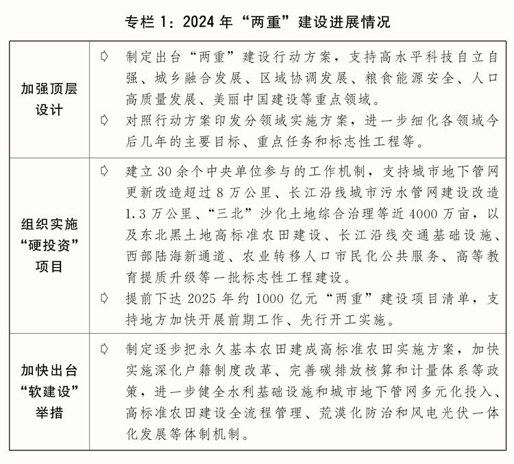 三是加力推進“兩重”建設。進一步完善自上而下的工作機制,加強“兩重”建設項目儲備,更好統籌“硬投資”與“軟建設”。安排超長期特別國債8000億元支持“兩重”建設,進一步優化具體投向並提高項目支持比例,重點支持基礎研究能力提升、未來產業發展、東北等重點地區高標準農田建設、大中型灌區新建改造及大中型引調水和大中型水庫建設、長江經濟帶生態環境保護和綠色發展、農業轉移人口市民化公共服務體係建設、高等教育提質升級、城市地下管網管廊建設改造等方面任務,強化超長期貸款等配套融資,高質量推進“硬投資”項目謀劃實施。加大力度推動“軟建設”政策落地見效。