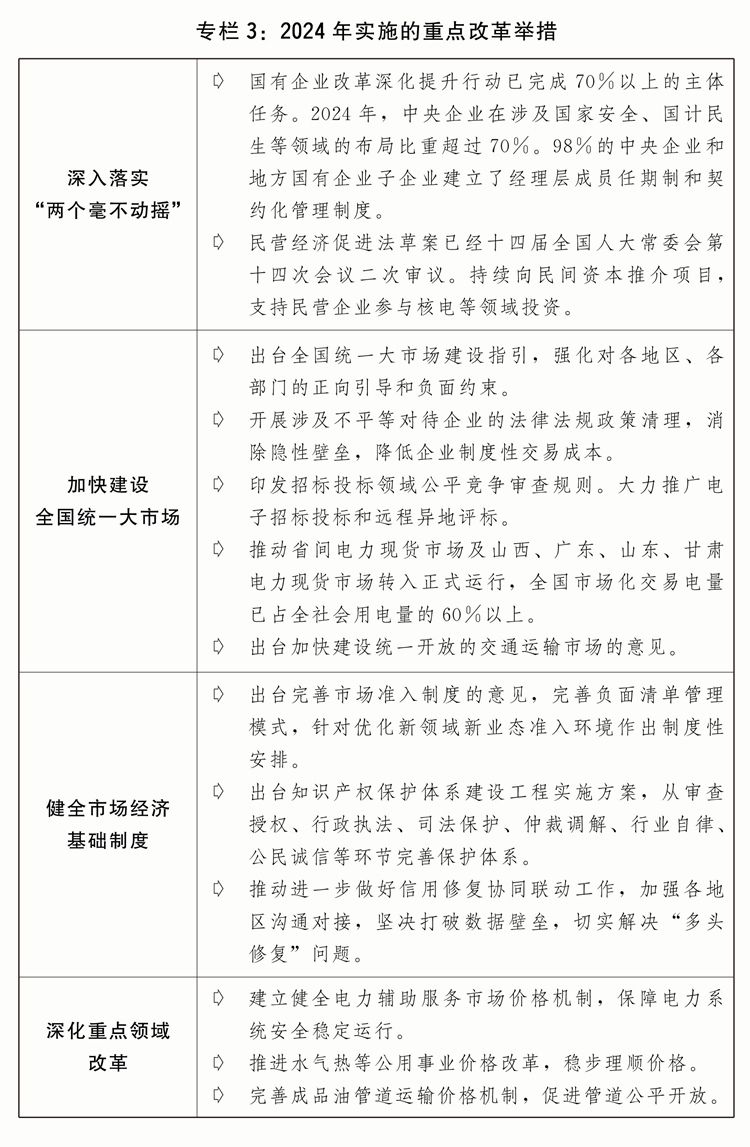 (二)進一步全面深化改革,發展動力活力不斷增強。認真落實黨的二十屆三中全會部署的重要改革舉措,深化經濟體制改革,經濟發展內生動力、創新活力持續激發。