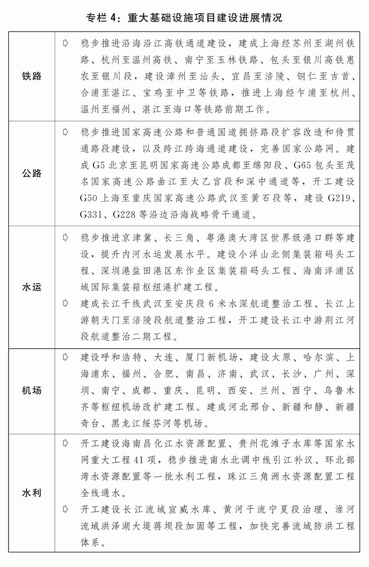 五是加快完善現代化基礎設施體係。高質量推進川藏鐵路等重大項目建設,加快構建國家水網工程體係,高水平共建西部陸海新通道。深入實施降低全社會物流成本專項行動。持續推進國家物流樞紐、國家骨幹冷鏈物流基地、國家綜合貨運樞紐體係、大宗商品資源配置樞紐等布局建設。加快完善應急物流體係。深入推進公路水路交通基礎設施數字化轉型升級。推動各種運輸方式規則標準統一協同,加快多式聯運“一單制、一箱制”應用。