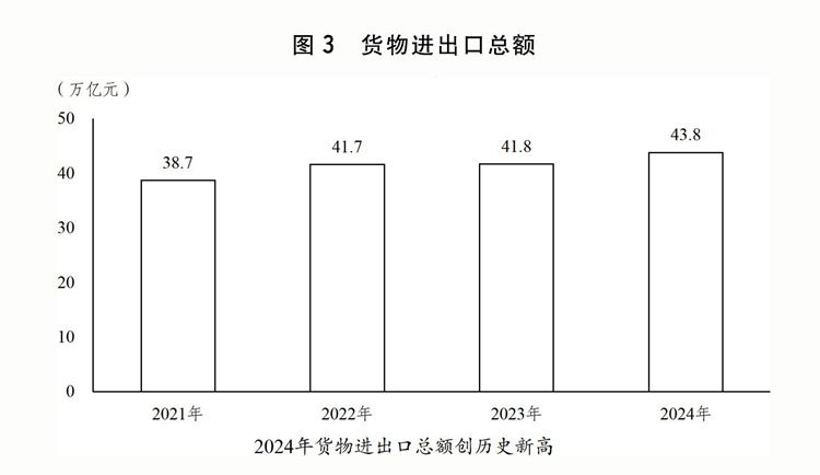 二是外貿出口對經濟增長貢獻增大。出臺關于促進外貿穩定增長、拓展跨境電商出口推進海外倉建設、推動服務貿易和數字貿易發展的政策,貨物和服務凈出口對經濟增長的貢獻率達30.3%。進博會、廣交會、服貿會、投洽會、中俄博覽會等重大展會成功舉辦。出臺扎實推進高水平對外開放更大力度吸引和利用外資行動方案。發布外商投資準入特別管理措施(負面清單)(2024年版),制造業領域外資準入限制措施全面取消。推進服務業擴大開放綜合試點示范,開展增值電信、生物技術、獨資醫院開放試點。發布實施全國版和自貿試驗區版跨境服務貿易負面清單。推出第八批標志性重大外資項目。健全境外投資管理服務體係。