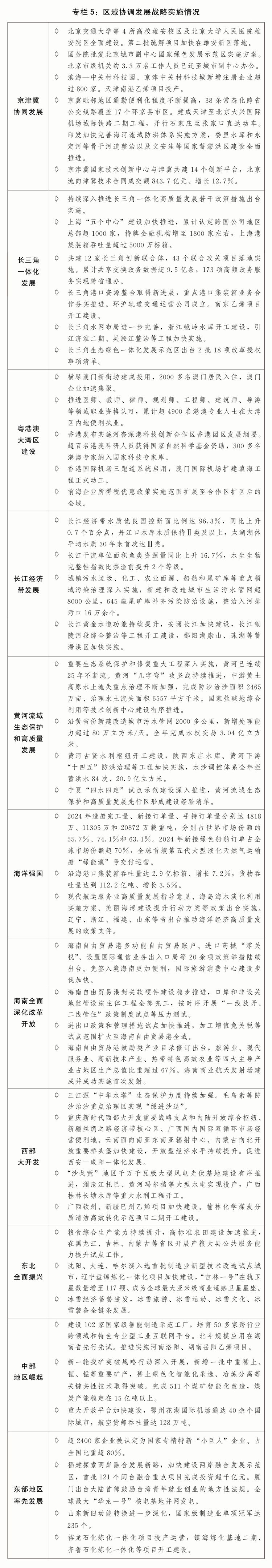一是區域協調發展積厚成勢。京津冀協同發展走深走實,在京相關高校、醫院、中央企業總部及二三級子公司分批向雄安新區疏解,北京城市副中心行政辦公、商務服務、文化旅遊等功能不斷完善,進一步支持天津濱海新區高質量發展若幹政策措施出臺實施,三省市互聯互通交通網絡更加完善、產業鏈上下遊協作持續強化、公共服務共建共享水平進一步提升。長三角一體化高質量發展深入推進,生態綠色一體化發展示范區改革授權壓茬推進,港口資源整合、軌道互聯互通等取得新進展,上海“五個中心”建設進一步加快。粵港澳大灣區建設邁上新臺階,橫琴粵澳深度合作區封關“一線”“二線”分線管理運行順利,超1.6萬名澳門居民在合作區居住生活,支持河套深港科技創新合作區深圳園區、香港園區聯動發展,創新要素跨境流動更加便捷。長江經濟帶共抓大保護、不搞大開發成效顯著,進一步抓實抓好長江大保護工作三年行動計劃出臺實施,長江十年禁漁取得明顯成效,長江幹流連續5年保持Ⅱ類水質,綜合立體交通走廊加快構建,沿江高鐵全線開工建設。黃河流域生態保護和高質量發展邁出堅實步伐,農業面源、城鎮生活、工業和尾礦庫污染治理深入推進,8萬余個入河排污口開展溯源整治,一批生態保護修復重點項目加快建設,黃河幹流連續3年保持Ⅱ類水質。海洋強國建設深入推進,海洋強省、現代海洋城市、全國海洋經濟發展示范區創新發展,海洋生態環境質量持續改善,海洋生產總值超10萬億元。