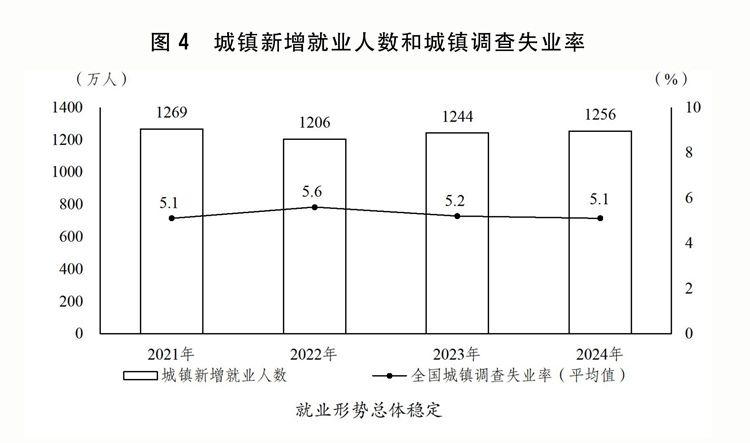 一是穩就業促增收取得積極成效。出臺實施就業優先戰略促進高質量充分就業的意見。延續實施失業保險援企穩崗政策,優化整合吸納就業補貼和擴崗補助。強化高校畢業生、脫貧人口、農民工以及就業困難人員等就業幫扶。實施高校畢業生等青年就業服務攻堅行動、先進制造業促就業行動和百萬就業見習崗位募集計劃,構建高校畢業生高質量就業服務體係。加大力度支持公共實訓基地建設,持續做好重點人群技能培訓。做好退役軍人就業服務保障,提高優撫補助標準。城鎮新增就業1256萬人,城鎮調查失業率平均為5.1%。全國居民人均可支配收入實際增長5.1%。城鄉居民人均可支配收入比為2.34,城鄉居民收入相對差距繼續縮小。指導地方上調最低工資標準。向困難群眾發放一次性生活補助,惠及1100多萬人。