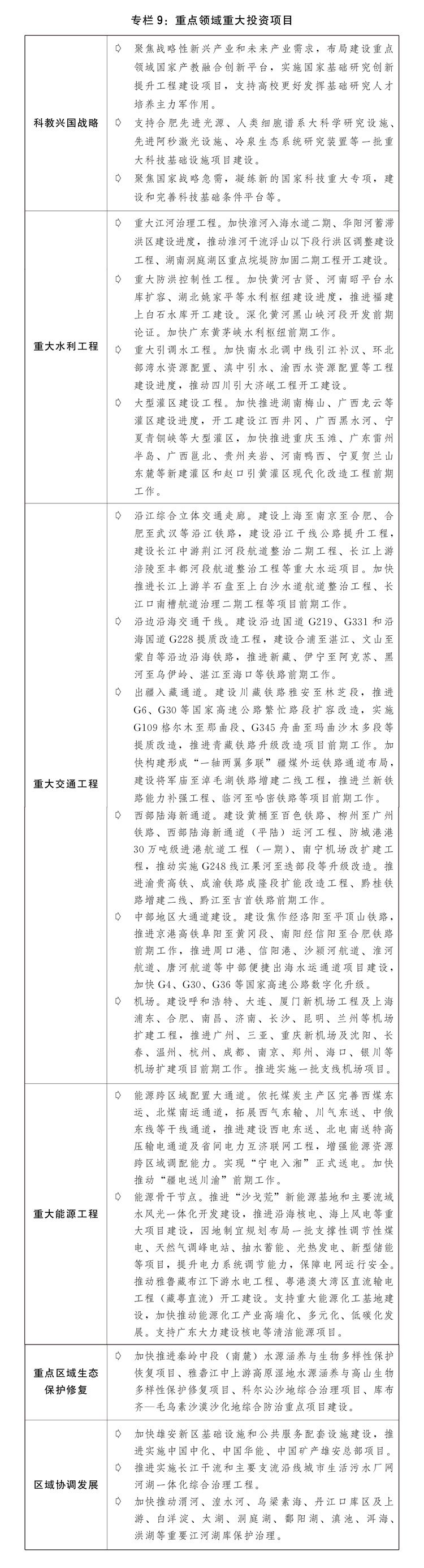 二是擴大有效益的投資。統籌傳統和新型基礎設施建設、傳統和新興產業發展、“投資于物”和“投資于人”,著力提高投資的經濟、社會、生態等綜合效益。2025年安排中央預算內投資7350億元,比2024年多350億元。扎實推進重大工程項目建設,推動“十四五”規劃102項重大工程圓滿收官,及早謀劃“十五五”重大項目。常態化做好項目謀劃儲備,加強用地、用海、用能、環評等要素和融資保障,高質量推進項目前期工作和建設實施,盡快形成實物工作量。加快地方政府專項債券發行使用,優化完善專項債券管理機制,額度分配向項目準備充分、投資效率較高、資金使用效益好的地區傾斜,擴大用作項目資本金的領域、比例,實施好投向領域“負面清單”管理、下放項目審核權限等措施,在部分省市開展“自審自發”試點。建立政府投資支持基礎性、公益性、長遠性重大項目建設長效機制。深化投資審批制度改革,完善項目全周期監督管理機制。更大力度促進民間投資,從放寬準入、權益保護、要素協同、融資支持等方面進一步健全民營企業參與國家重大項目建設的長效機制,常態化向民間資本推介項目,在鐵路、核電、水利、生態環保、倉儲物流、新型基礎設施、公共服務等領域推出一批吸引民間資本參與的重大項目,規范實施政府和社會資本合作(PPP)新機制,推動基礎設施領域不動產投資信托基金(REITs)擴圍擴容。