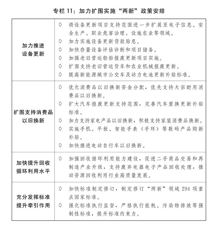 四是加力擴圍實施“兩新”政策。安排超長期特別國債5000億元支持大規模設備更新和消費品以舊換新,統籌投資、財政、金融等綜合性政策,深入推進設備更新、消費品以舊換新、回收循環利用、標準提升四大行動。進一步加大重點領域設備更新項目支持力度,加力實施設備更新貸款貼息,加快存量設備評估診斷和項目儲備。進一步支持消費品以舊換新,擴大汽車報廢更新支持范圍,完善汽車置換更新補貼標準,實施手機、平板等數碼產品購新補貼,積極支持家裝消費品換新,簡化補貼申領和支付流程,完善資金監管機制,嚴厲打擊價格欺詐和違規騙補套補行為。