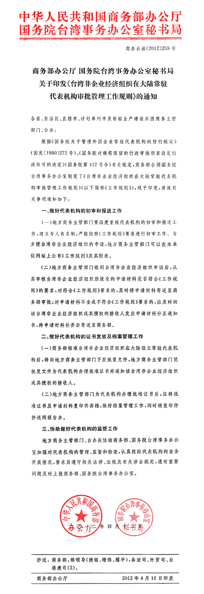 商務部辦公廳 國務院臺灣事務辦公室秘書局關于印發《臺灣非企業經濟組織在大陸常駐代表機構審批管理工作規則》的通知