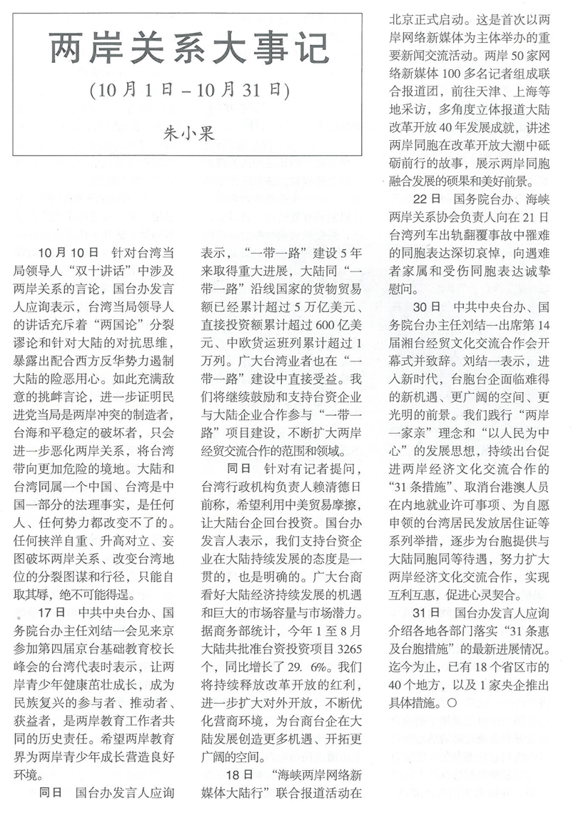 兩岸關係大事記(2018年10月1日-10月31日)