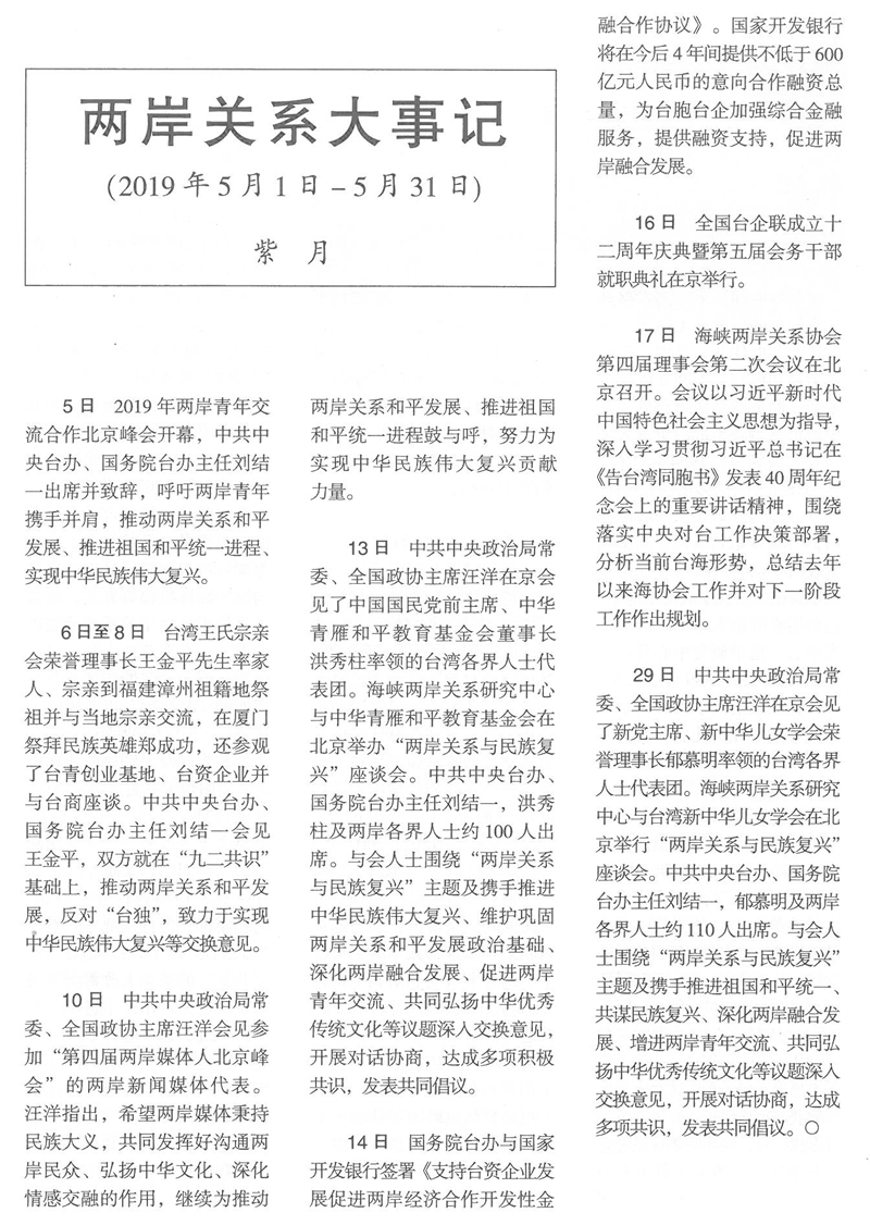 兩岸關係大事記(2019年5月1日-5月30日)