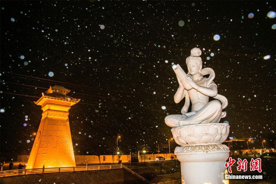 1月20日夜晚,敦煌市黨河風情線落雪的場景。(王斌銀 攝)