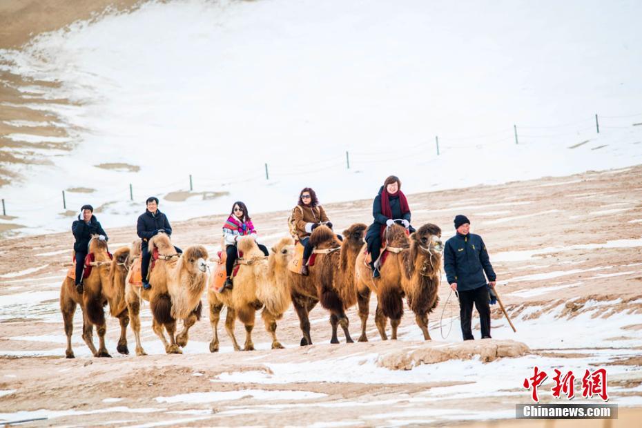 1月21日,遊客騎駱駝暢遊難得一見的“大漠雪景”。 (王斌銀 攝)