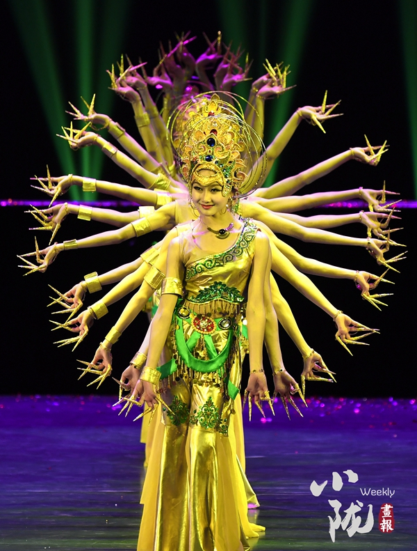《千手觀音》脫穎于敦煌壁畫千手眼觀音變造型。豐富的手姿、端莊的眼神、變化莫測的畫面,塑造了一尊端莊、善良、高雅、慈祥的千手觀音形象。