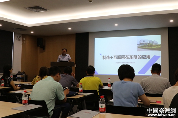 浙江東明不鏽鋼制品股份有限公司總經理蔡弘泉向兩岸記者介紹“互聯網+制造”。(中國臺灣網 李奕均 攝)