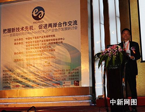 圍繞開源手機操作係統Android技術與應用的首屆“海峽兩岸Android技術及產業合作發展研討會”,十五日在北京舉行。來自兩岸的專家及業者代表五百多人參加了會議。圖為臺北市電腦公會副總幹事張笠在會上發言。 路梅 攝