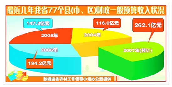 省農村工作領導小組辦公室的最新統計顯示,2007年全省44個縣(市)生產總值可實現4000億元,同比增長21%;縣域財政一般預算收入將達到262.1億元,同比增長30%以上。農業增加值將突破1190億元,可比價增長7%;全省糧食產量1835萬噸,同比增長6.4%;肉、蛋、奶產量將分別達到395萬噸、248萬噸和119.8萬噸,同比增長6.2%、4.5%和23%;水產品總量實現448萬噸。全省農村固定資產同比增長32%;農業實際利用外資、農產品出口創匯同比增長20%以上;全省農民人均純收入可實現4660元左右,實際增長9%左右。