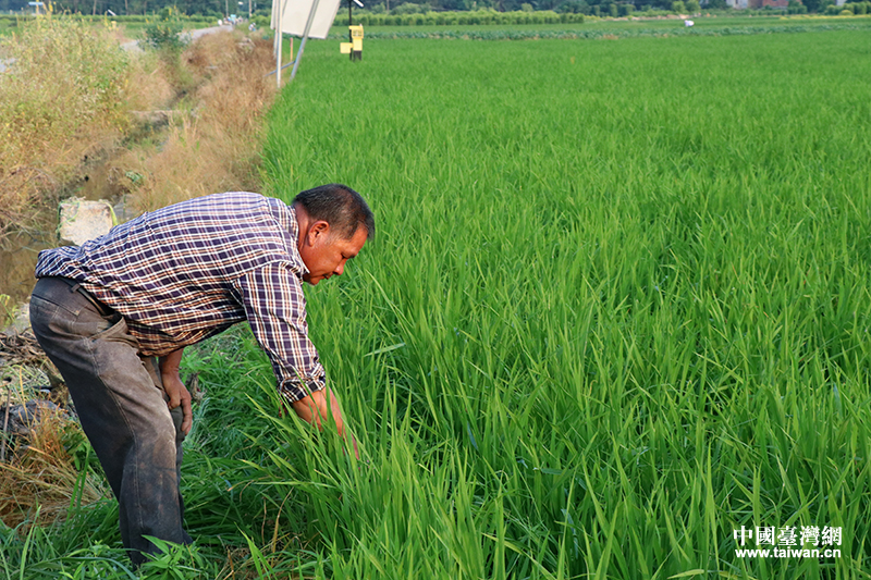 官潯鎮坤山農業專業合作社負責人王坤山正在察看晚稻長勢。(中國臺灣網發)