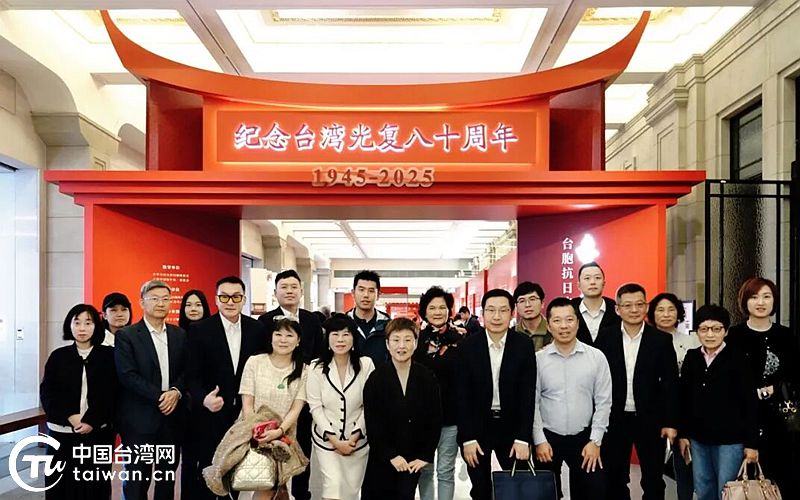 與會代表在“赤子同心補金甌”紀念臺灣光復80周年暨臺胞抗日史料展展廳合影。(中國臺灣網發)