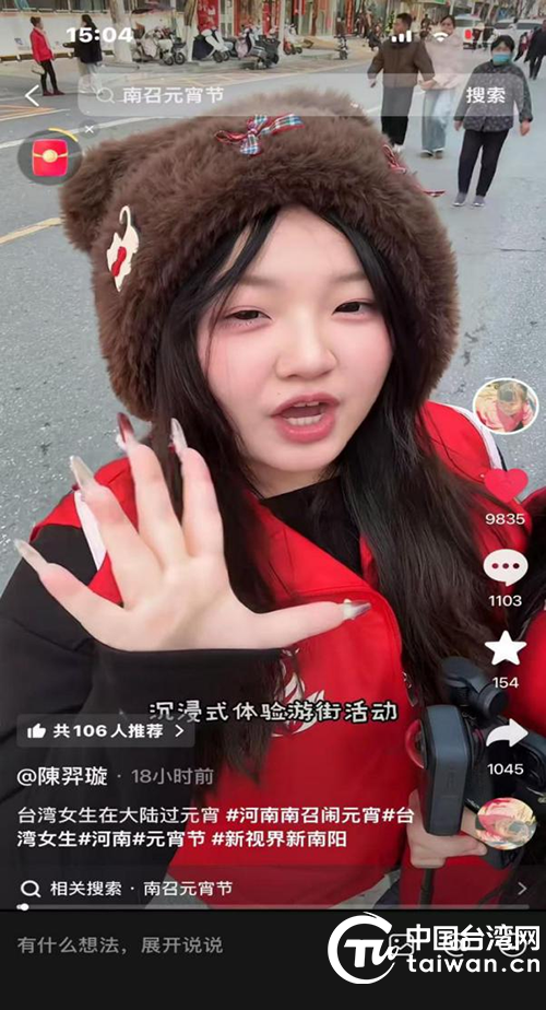 中國臺灣網3月9日訊 人間燈火,團圓你我。為深化豫臺民俗文化交流,讓臺灣同胞近距離感受大陸傳統節日魅力,元宵佳節期間,臺灣網紅陳羿璇走進南召,沉浸式體驗一係列元宵節活動,以鏡頭為媒向臺灣同胞展現千年古縣的節日盛景。